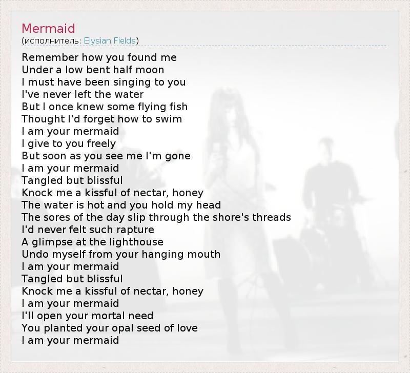 Remember how you found me Under a low bent half moon I must have been singing to you I've never left the water But I once knew some flying fish Thought I'd forget how to swim I am your mermaid I give to you freely But soon as you see me I'm gone I am your mermaid Tangled but blissful Knock me a kissful of nectar, honey The water is hot and you hold my head The sores of the day slip through the shore's threads I'd never felt such rapture A glimpse at the lighthouse Undo myself from your hanging mouth I am your mermaid Tangled but blissful Knock me a kissful of nectar, honey I am your mermaid I'll open your mortal need You planted your opal seed of love I am your mermaid