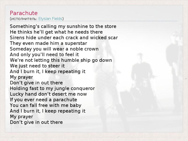 Something's calling my sunshine to the store He thinks he'll get what he needs there Sirens hide under each crack and wicked scar They even made him a superstar Someday you will wear a noble crown And only you'll need to feel it We're not letting this humble ship go down We just need to steer it And I burn it, I keep repeating it My prayer Don't give in out there Holding fast to my jungle conqueror Lucky hand don't desert me now If you ever need a parachute You can fall free with me baby And I burn it, I keep repeating it My prayer Don't give in out there