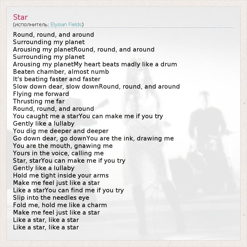 Round, round, and around Surrounding my planet Arousing my planetRound, round, and around Surrounding my planet Arousing my planetMy heart beats madly like a drum Beaten chamber, almost numb It's beating faster and faster Slow down dear, slow downRound, round, and around Flying me forward Thrusting me far Round, round, and around You caught me a starYou can make me if you try Gently like a lullaby You dig me deeper and deeper Go down dear, go downYou are the ink, drawing me You are the mouth, gnawing me Yours in the voice, calling me Star, starYou can make me if you try Gently like a lullaby Hold me tight inside your arms Make me feel just like a star Like a starYou can find me if you try Slip into the needles eye Fold me, hold me like a charm Make me feel just like a star Like a star, like a star Like a star, like a star