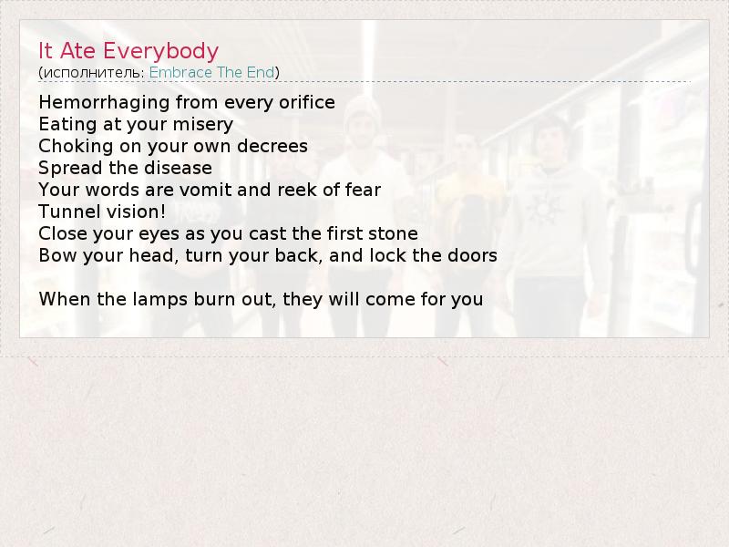 А как ты думаешь, о чем песня "It Ate Everybody" ?
