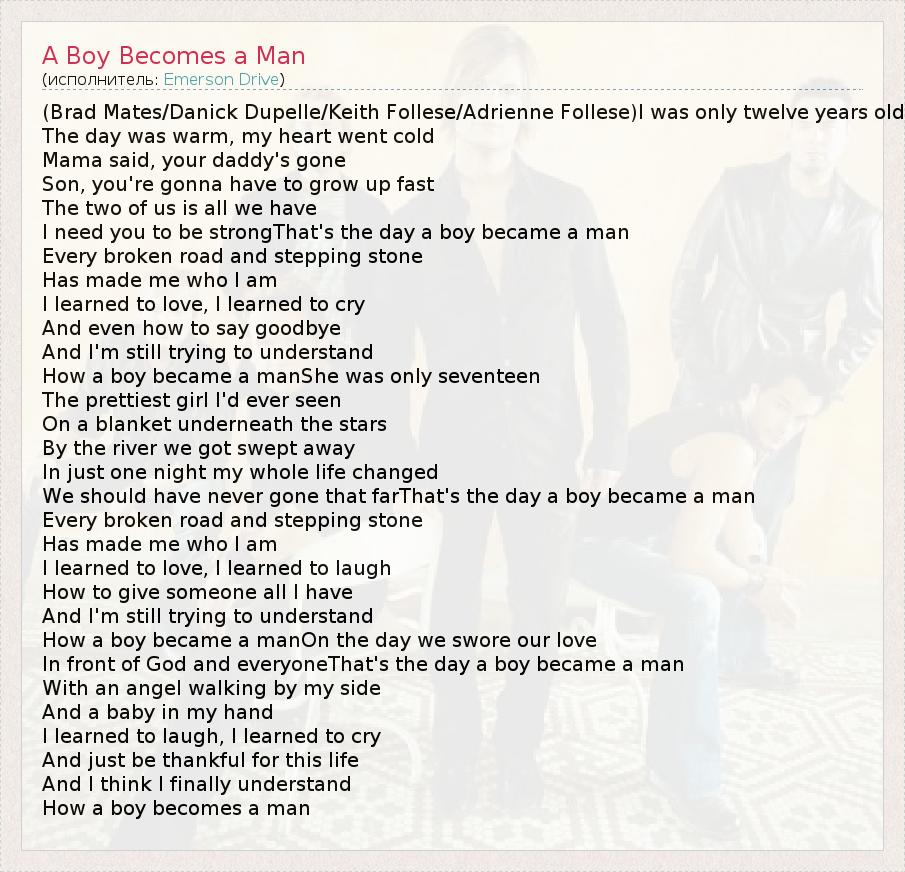 (Brad Mates/Danick Dupelle/Keith Follese/Adrienne Follese)I was only twelve years old The day was warm, my heart went cold Mama said, your daddy's gone Son, you're gonna have to grow up fast The two of us is all we have I need you to be strongThat's the day a boy became a man Every broken road and stepping stone Has made me who I am I learned to love, I learned to cry And even how to say goodbye And I'm still trying to understand How a boy became a manShe was only seventeen The prettiest girl I'd ever seen On a blanket underneath the stars By the river we got swept away In just one night my whole life changed We should have never gone that farThat's the day a boy became a man Every broken road and stepping stone Has made me who I am I learned to love, I learned to laugh How to give someone all I have And I'm still trying to understand How a boy became a manOn the day we swore our love In front of God and everyoneThat's the day a boy became a man With an angel walking by my side And a baby in my hand I learned to laugh, I learned to cry And just be thankful for this life And I think I finally understand How a boy becomes a man