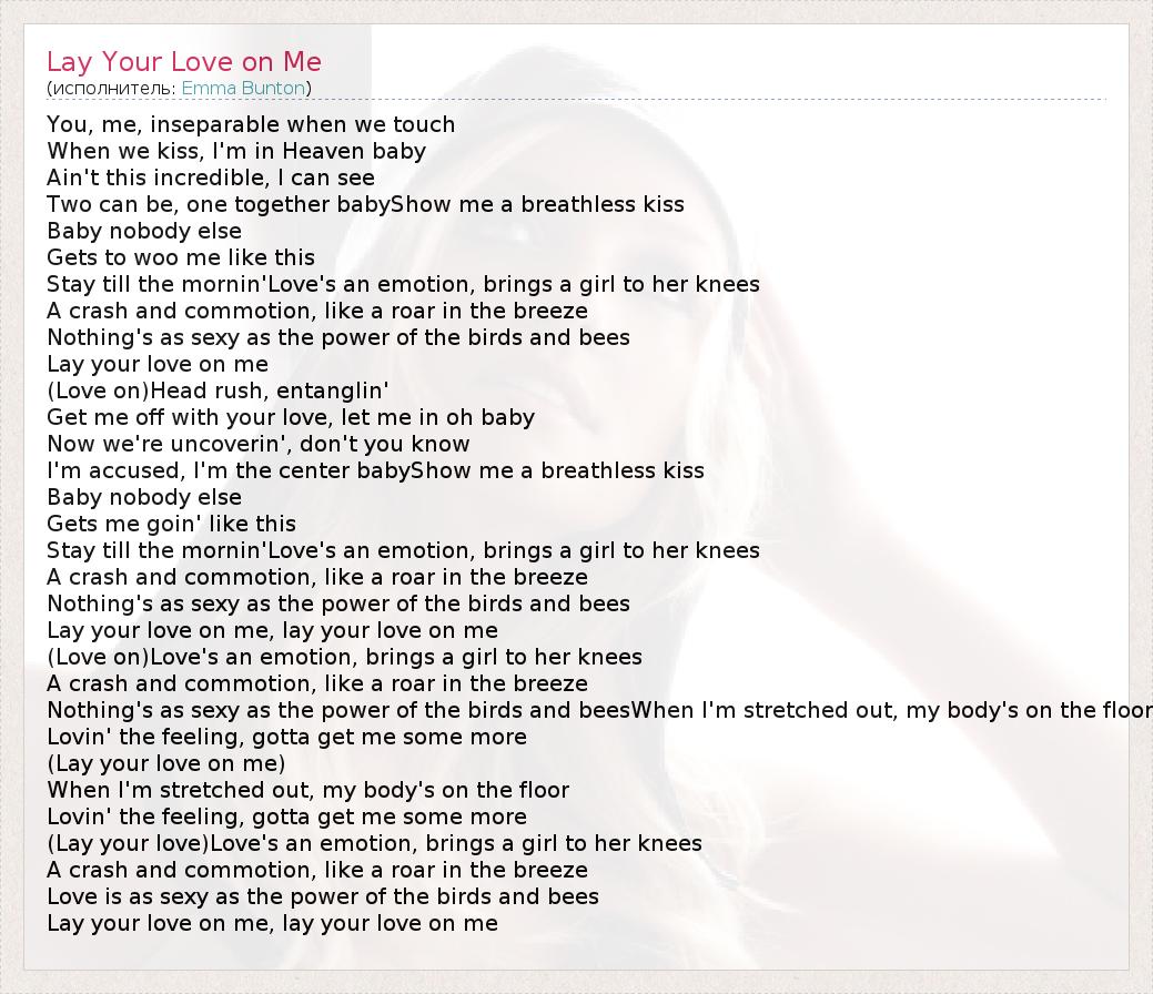 You, me, inseparable when we touch When we kiss, I'm in Heaven baby Ain't this incredible, I can see Two can be, one together babyShow me a breathless kiss Baby nobody else Gets to woo me like this Stay till the mornin'Love's an emotion, brings a girl to her knees A crash and commotion, like a roar in the breeze Nothing's as sexy as the power of the birds and bees Lay your love on me (Love on)Head rush, entanglin' Get me off with your love, let me in oh baby Now we're uncoverin', don't you know I'm accused, I'm the center babyShow me a breathless kiss Baby nobody else Gets me goin' like this Stay till the mornin'Love's an emotion, brings a girl to her knees A crash and commotion, like a roar in the breeze Nothing's as sexy as the power of the birds and bees Lay your love on me, lay your love on me (Love on)Love's an emotion, brings a girl to her knees A crash and commotion, like a roar in the breeze Nothing's as sexy as the power of the birds and beesWhen I'm stretched out, my body's on the floor Lovin' the feeling, gotta get me some more (Lay your love on me) When I'm stretched out, my body's on the floor Lovin' the feeling, gotta get me some more (Lay your love)Love's an emotion, brings a girl to her knees A crash and commotion, like a roar in the breeze Love is as sexy as the power of the birds and bees Lay your love on me, lay your love on me