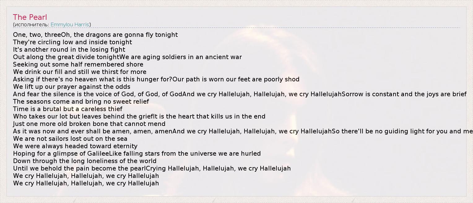 Это интересно:Эммилу Харрис (англ. Emmylou Harris, род. 2 апреля 1947) — американская певица, автор-исполнитель, получившая наибольшую популярность в качестве исполнительницы кантри.Эмилу Харрис родилась в Бирменгеме, штат Алабама, в семье Уолтера и Юджин Харрис, а детство провела недалеко от Вашингтона, округ Колумбия. В конце 1960-х, будучи студенткой колледжа, она выступала в местном фольклорном дуэте. В... продолжение