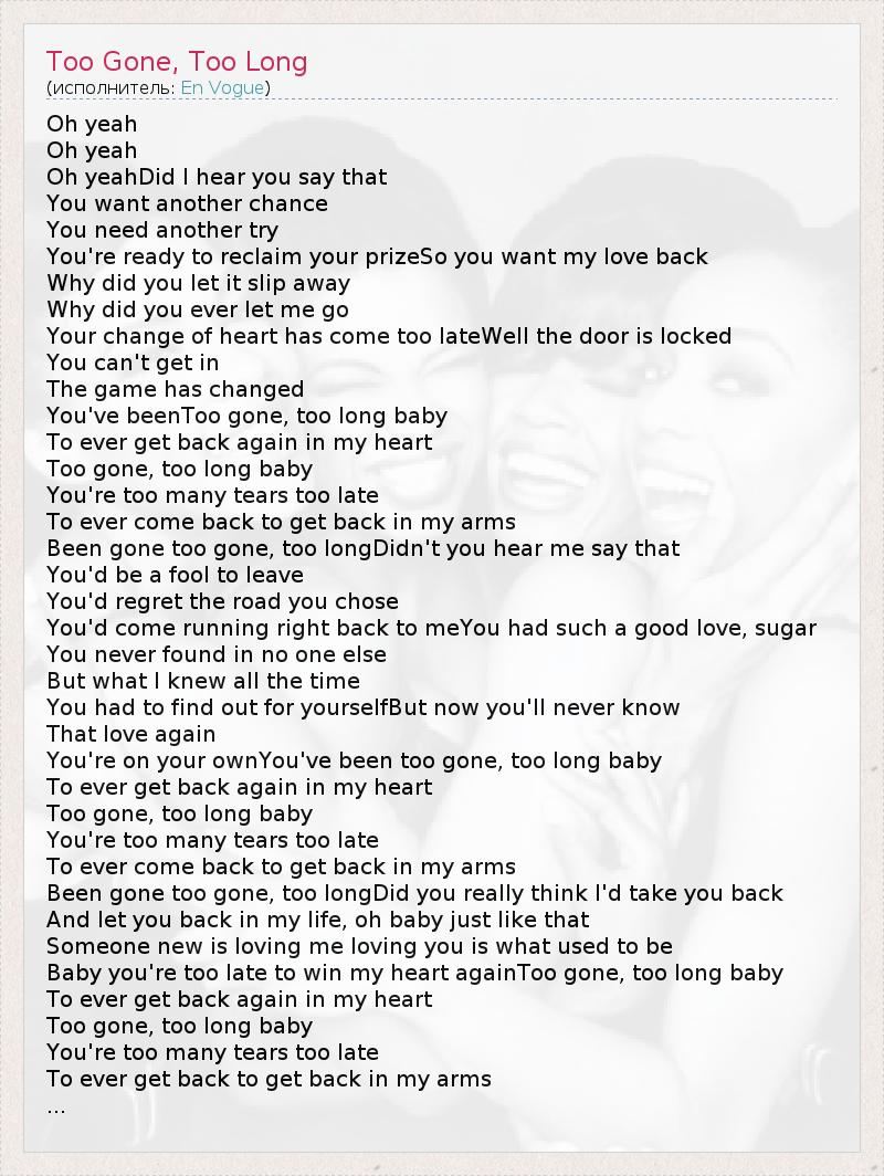 Been gone too gone, too longDidn't you hear me say that