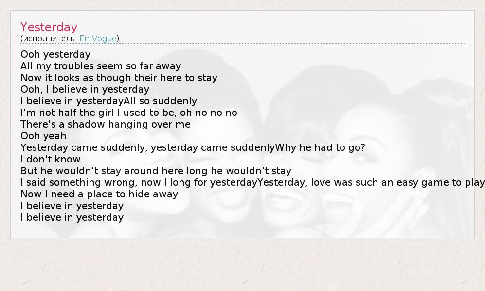А как ты думаешь, о чем песня "Yesterday" ?