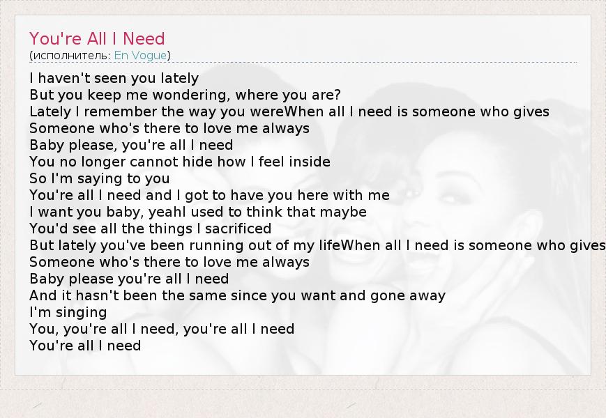 А как ты думаешь, о чем песня "You're All I Need" ?