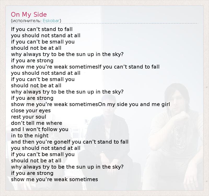 If you can't stand to fall you should not stand at all if you can't be small you should not be at all why always try to be the sun up in the sky? if you are strong show me you're weak sometimesIf you can't stand to fall you should not stand at all if you can't be small you should not be at all why always try to be the sun up in the sky? if you are strong show me you're weak sometimesOn my side you and me girl close your eyes rest your soul don't tell me where and I won't follow you in to the night and then you're goneIf you can't stand to fall you should not stand at all if you can't be small you should not be at all why always try to be the sun up in the sky? if you are strong show me you're weak sometimes