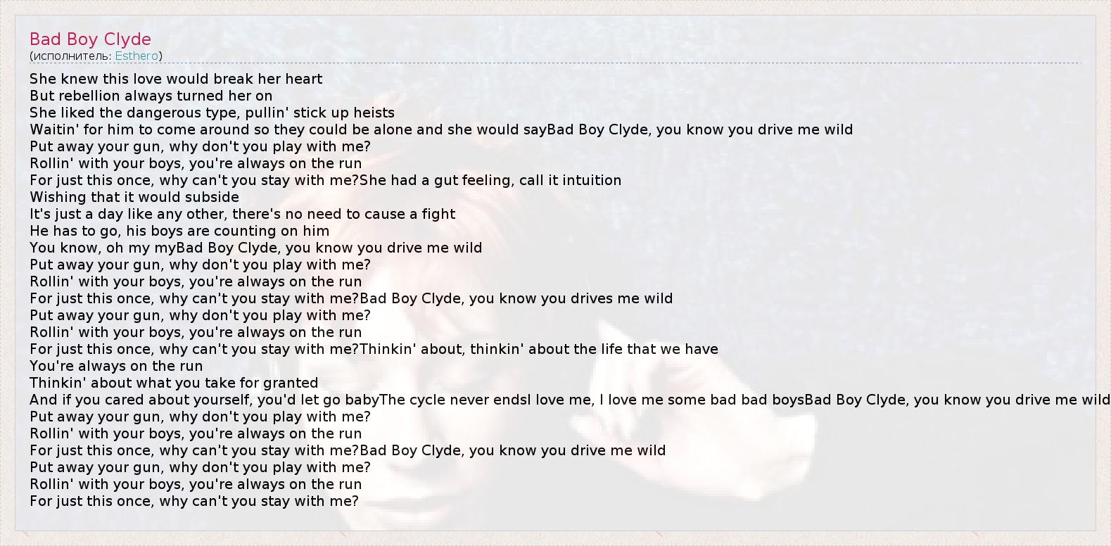 She knew this love would break her heart But rebellion always turned her on She liked the dangerous type, pullin' stick up heists Waitin' for him to come around so they could be alone and she would sayBad Boy Clyde, you know you drive me wild Put away your gun, why don't you play with me? Rollin' with your boys, you're always on the run For just this once, why can't you stay with me?She had a gut feeling, call it intuition Wishing that it would subside It's just a day like any other, there's no need to cause a fight He has to go, his boys are counting on him You know, oh my myBad Boy Clyde, you know you drive me wild Put away your gun, why don't you play with me? Rollin' with your boys, you're always on the run For just this once, why can't you stay with me?Bad Boy Clyde, you know you drives me wild Put away your gun, why don't you play with me? Rollin' with your boys, you're always on the run For just this once, why can't you stay with me?Thinkin' about, thinkin' about the life that we have You're always on the run Thinkin' about what you take for granted And if you cared about yourself, you'd let go babyThe cycle never endsI love me, I love me some bad bad boysBad Boy Clyde, you know you drive me wild Put away your gun, why don't you play with me? Rollin' with your boys, you're always on the run For just this once, why can't you stay with me?Bad Boy Clyde, you know you drive me wild Put away your gun, why don't you play with me? Rollin' with your boys, you're always on the run For just this once, why can't you stay with me?