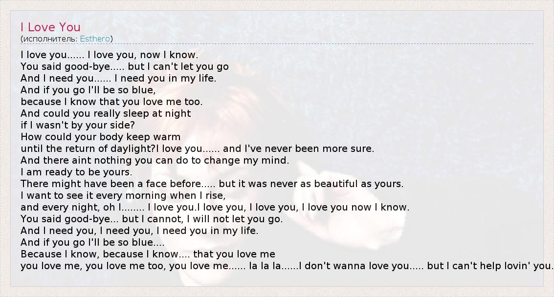 I love you...... I love you, now I know. You said good-bye..... but I can't let you go And I need you...... I need you in my life. And if you go I'll be so blue, because I know that you love me too. And could you really sleep at night if I wasn't by your side? How could your body keep warm until the return of daylight?I love you...... and I've never been more sure. And there aint nothing you can do to change my mind. I am ready to be yours. There might have been a face before..... but it was never as beautiful as yours. I want to see it every morning when I rise, and every night, oh I........ I love you.I love you, I love you, I love you now I know. You said good-bye... but I cannot, I will not let you go. And I need you, I need you, I need you in my life. And if you go I'll be so blue.... Because I know, because I know.... that you love me you love me, you love me too, you love me...... la la la......I don't wanna love you..... but I can't help lovin' you.