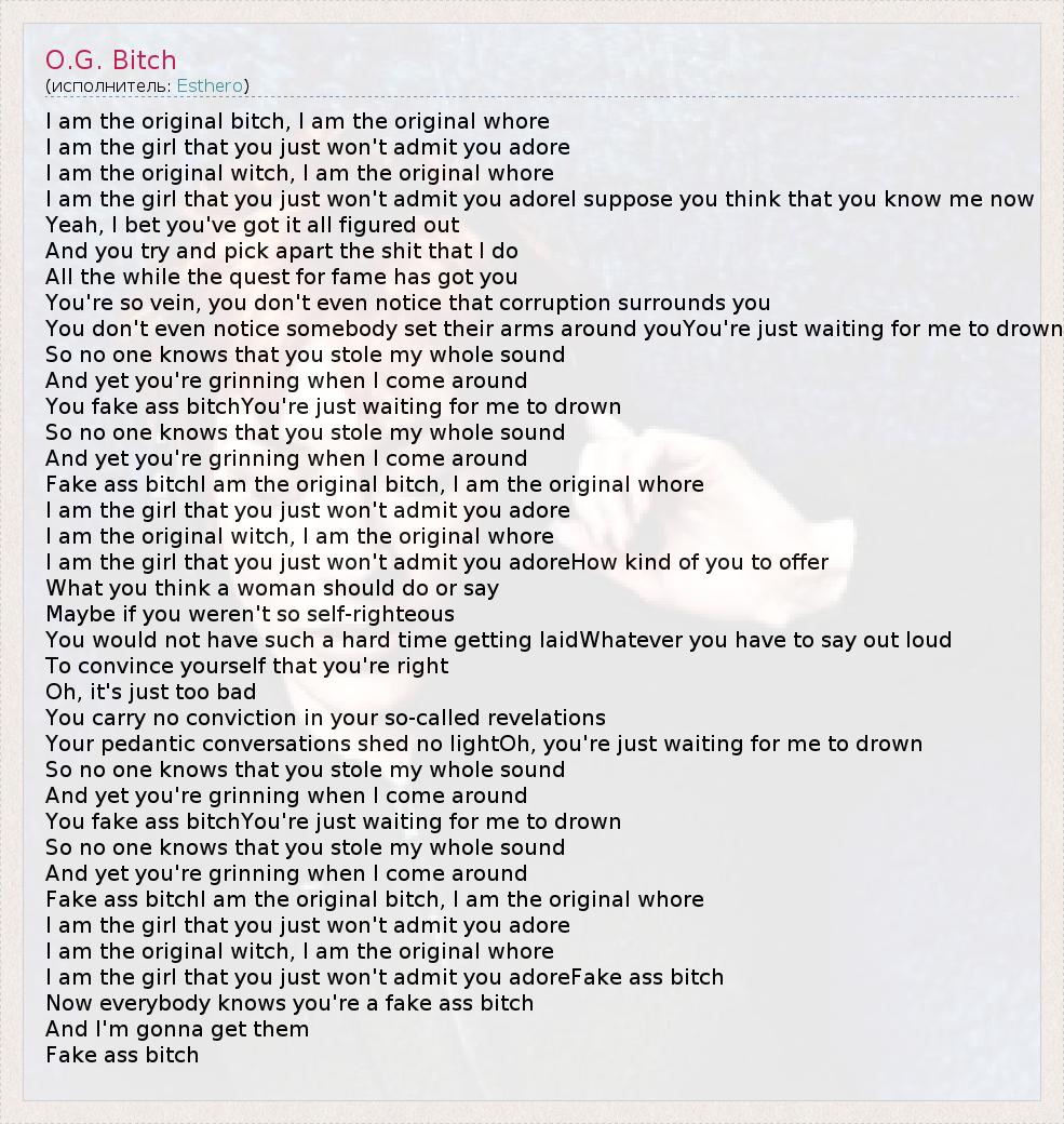 I am the original bitch, I am the original whore I am the girl that you just won't admit you adore I am the original witch, I am the original whore I am the girl that you just won't admit you adoreI suppose you think that you know me now Yeah, I bet you've got it all figured out And you try and pick apart the shit that I do All the while the quest for fame has got you You're so vein, you don't even notice that corruption surrounds you You don't even notice somebody set their arms around youYou're just waiting for me to drown So no one knows that you stole my whole sound And yet you're grinning when I come around You fake ass bitchYou're just waiting for me to drown So no one knows that you stole my whole sound And yet you're grinning when I come around Fake ass bitchI am the original bitch, I am the original whore I am the girl that you just won't admit you adore I am the original witch, I am the original whore I am the girl that you just won't admit you adoreHow kind of you to offer What you think a woman should do or say Maybe if you weren't so self-righteous You would not have such a hard time getting laidWhatever you have to say out loud To convince yourself that you're right Oh, it's just too bad You carry no conviction in your so-called revelations Your pedantic conversations shed no lightOh, you're just waiting for me to drown So no one knows that you stole my whole sound And yet you're grinning when I come around You fake ass bitchYou're just waiting for me to drown So no one knows that you stole my whole sound And yet you're grinning when I come around Fake ass bitchI am the original bitch, I am the original whore I am the girl that you just won't admit you adore I am the original witch, I am the original whore I am the girl that you just won't admit you adoreFake ass bitch Now everybody knows you're a fake ass bitch And I'm gonna get them Fake ass bitch