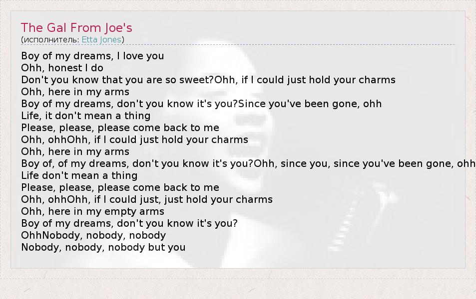 А как ты думаешь, о чем песня "The Gal From Joe's" ?