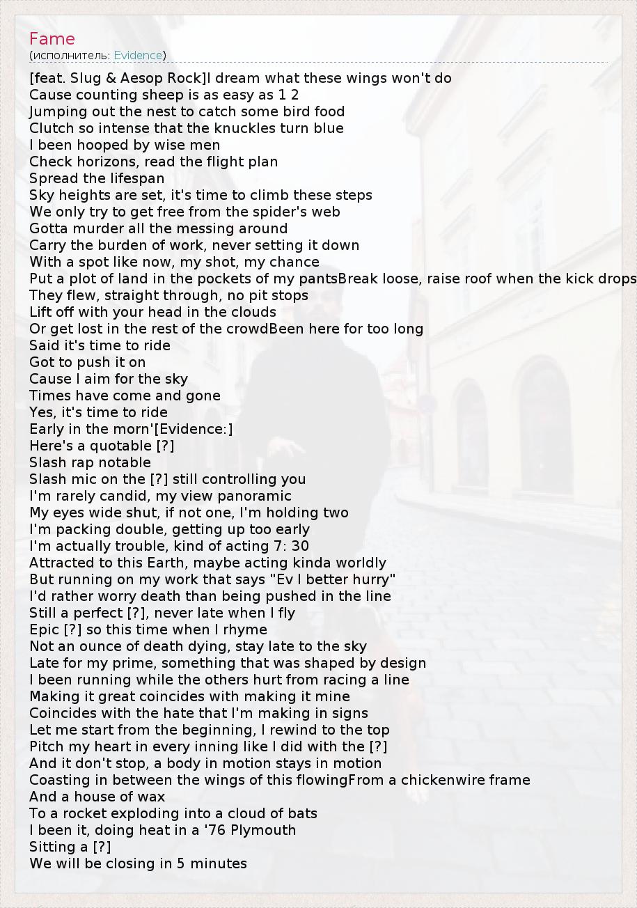 [feat. Slug & Aesop Rock]I dream what these wings won't do Cause counting sheep is as easy as 1 2 Jumping out the nest to catch some bird food Clutch so intense that the knuckles turn blue I been hooped by wise men Check horizons, read the flight plan Spread the lifespan Sky heights are set, it's time to climb these steps We only try to get free from the spider's web Gotta murder all the messing around Carry the burden of work, never setting it down With a spot like now, my shot, my chance Put a plot of land in the pockets of my pantsBreak loose, raise roof when the kick drops They flew, straight through, no pit stops Lift off with your head in the clouds Or get lost in the rest of the crowdBeen here for too long Said it's time to ride Got to push it on Cause I aim for the sky Times have come and gone Yes, it's time to ride Early in the morn'[Evidence:] Here's a quotable [?] Slash rap notable Slash mic on the [?] still controlling you I'm rarely candid, my view panoramic My eyes wide shut, if not one, I'm holding two I'm packing double, getting up too early I'm actually trouble, kind of acting 7: 30 Attracted to this Earth, maybe acting kinda worldly But running on my work that says "Ev I better hurry" I'd rather worry death than being pushed in the line Still a perfect [?], never late when I fly Epic [?] so this time when I rhyme Not an ounce of death dying, stay late to the sky Late for my prime, something that was shaped by design I been running while the others hurt from racing a line Making it great coincides with making it mine Coincides with the hate that I'm making in signs Let me start from the beginning, I rewind to the top Pitch my heart in every inning like I did with the [?] And it don't stop, a body in motion stays in motion Coasting in between the wings of this flowingFrom a chickenwire frame And a house of wax To a rocket exploding into a cloud of bats I been it, doing heat in a '76 Plymouth Sitting a [?] We will be closing in 5 minutes