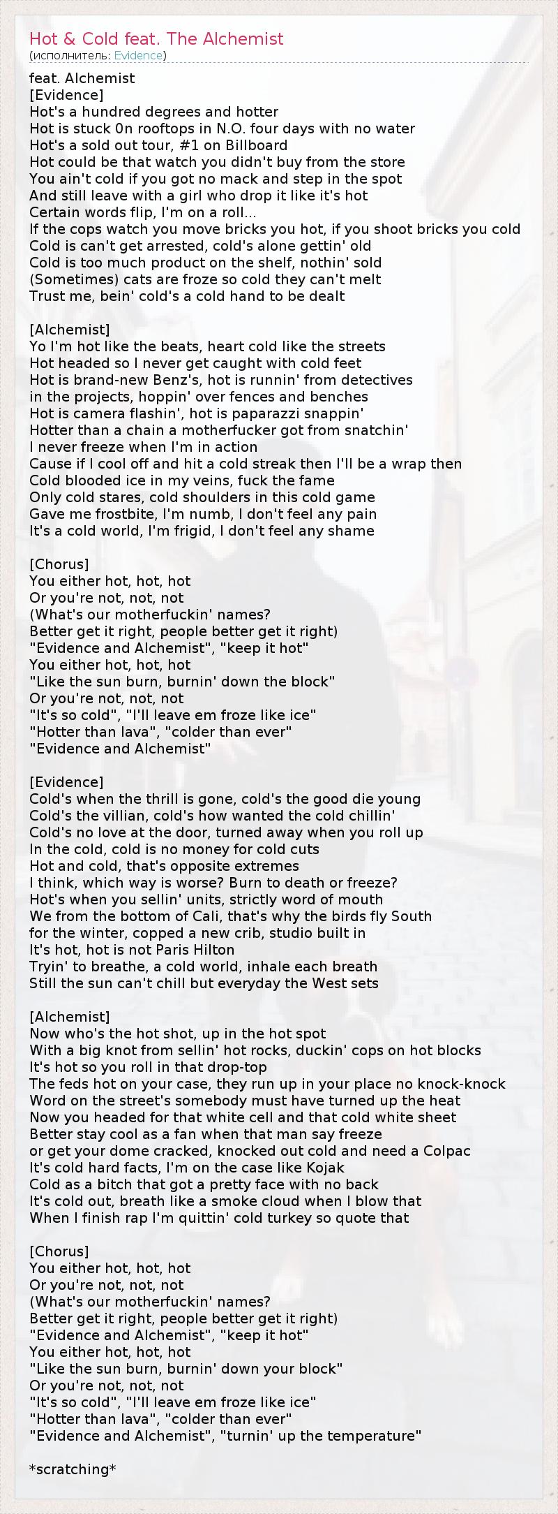 ГлавнаяИсполнителиEvidenceHot & Cold feat. The Alchemist
