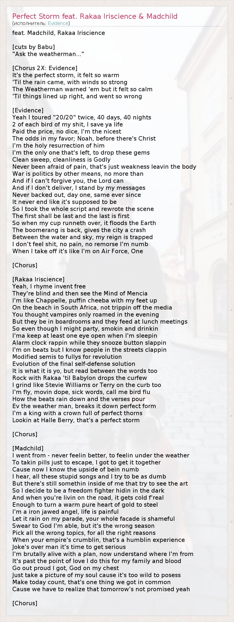 А как ты думаешь, о чем песня "Perfect Storm feat. Rakaa Iriscience & Madchild" ?