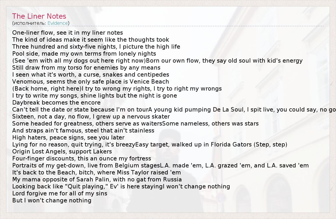 А как ты думаешь, о чем песня "The Liner Notes" ?
