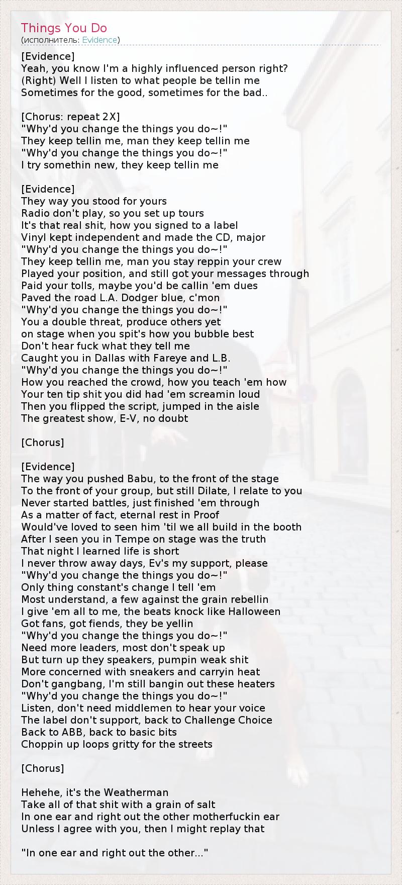Это интересно:Michael Perretta (Майкл Перетта), более известный как Evidence, родился 10 декабря 1976. Американский хип-хоп артист, продюсер и участник рэп-группы Dilated Peoples. Родился в США, в городе Venice (Венайс), штат California (Калифорния), в семье отца - итальянца и матери - американки польского происхождения. Помимо всего прочего - продюсирования и занятия рэп-музыкой, Эвидэнс известен как отличный... продолжение