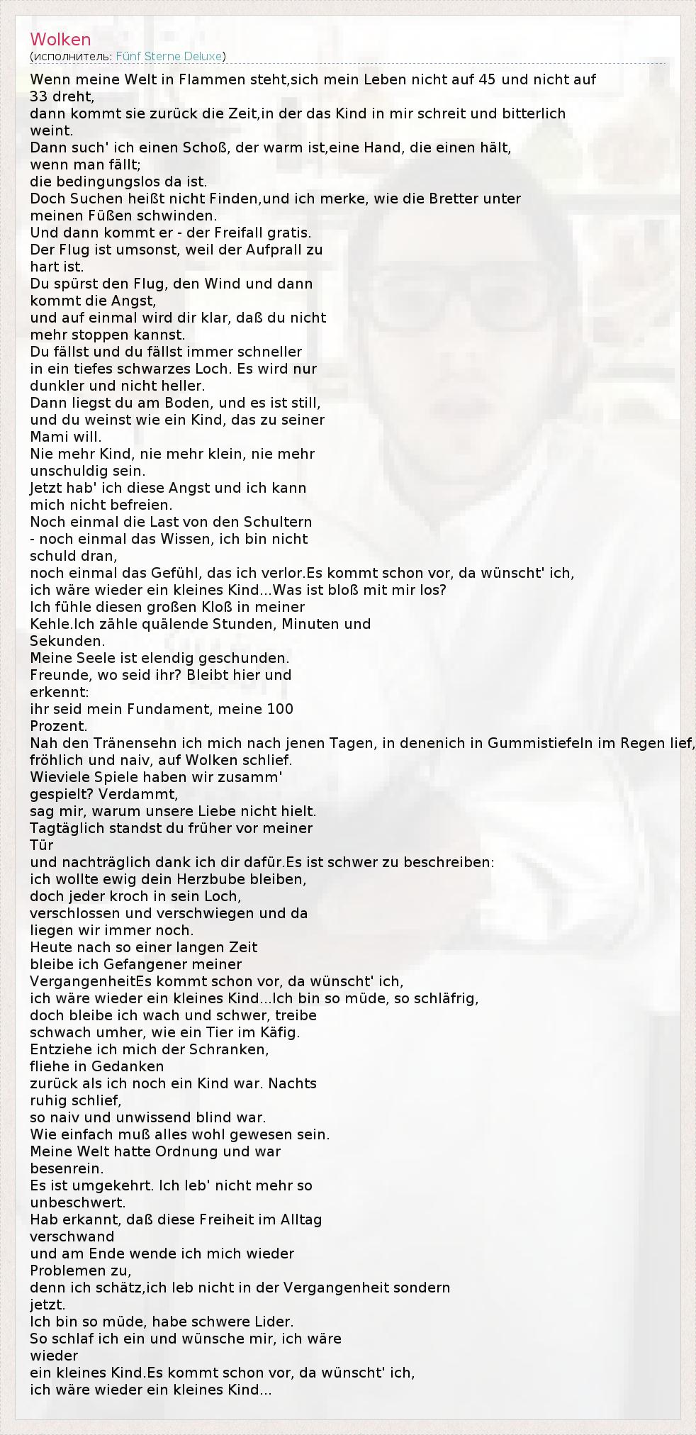 Wenn meine Welt in Flammen steht,sich mein Leben nicht auf 45 und nicht auf 33 dreht, dann kommt sie zurück die Zeit,in der das Kind in mir schreit und bitterlich weint. Dann such' ich einen Schoß, der warm ist,eine Hand, die einen hält, wenn man fällt; die bedingungslos da ist. Doch Suchen heißt nicht Finden,und ich merke, wie die Bretter unter meinen Füßen schwinden. Und dann kommt er - der Freifall gratis. Der Flug ist umsonst, weil der Aufprall zu hart ist. Du spürst den Flug, den Wind und dann kommt die Angst, und auf einmal wird dir klar, daß du nicht mehr stoppen kannst. Du fällst und du fällst immer schneller in ein tiefes schwarzes Loch. Es wird nur dunkler und nicht heller. Dann liegst du am Boden, und es ist still, und du weinst wie ein Kind, das zu seiner Mami will. Nie mehr Kind, nie mehr klein, nie mehr unschuldig sein. Jetzt hab' ich diese Angst und ich kann mich nicht befreien. Noch einmal die Last von den Schultern - noch einmal das Wissen, ich bin nicht schuld dran, noch einmal das Gefühl, das ich verlor.Es kommt schon vor, da wünscht' ich, ich wäre wieder ein kleines Kind...Was ist bloß mit mir los? Ich fühle diesen großen Kloß in meiner Kehle.Ich zähle quälende Stunden, Minuten und Sekunden. Meine Seele ist elendig geschunden. Freunde, wo seid ihr? Bleibt hier und erkennt: ihr seid mein Fundament, meine 100 Prozent. Nah den Tränensehn ich mich nach jenen Tagen, in denenich in Gummistiefeln im Regen lief, fröhlich und naiv, auf Wolken schlief. Wieviele Spiele haben wir zusamm' gespielt? Verdammt, sag mir, warum unsere Liebe nicht hielt. Tagtäglich standst du früher vor meiner Tür und nachträglich dank ich dir dafür.Es ist schwer zu beschreiben: ich wollte ewig dein Herzbube bleiben, doch jeder kroch in sein Loch, verschlossen und verschwiegen und da liegen wir immer noch. Heute nach so einer langen Zeit bleibe ich Gefangener meiner VergangenheitEs kommt schon vor, da wünscht' ich, ich wäre wieder ein kleines Kind...Ich bin so müde, so schläfrig, doch bleibe ich wach und schwer, treibe schwach umher, wie ein Tier im Käfig. Entziehe ich mich der Schranken, fliehe in Gedanken zurück als ich noch ein Kind war. Nachts ruhig schlief, so naiv und unwissend blind war. Wie einfach muß alles wohl gewesen sein. Meine Welt hatte Ordnung und war besenrein. Es ist umgekehrt. Ich leb' nicht mehr so unbeschwert. Hab erkannt, daß diese Freiheit im Alltag verschwand und am Ende wende ich mich wieder Problemen zu, denn ich schätz,ich leb nicht in der Vergangenheit sondern jetzt. Ich bin so müde, habe schwere Lider. So schlaf ich ein und wünsche mir, ich wäre wieder ein kleines Kind.Es kommt schon vor, da wünscht' ich, ich wäre wieder ein kleines Kind...