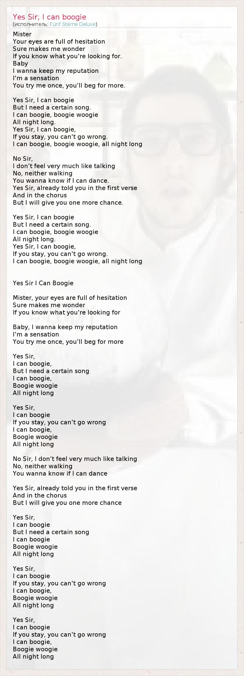 Мистер, Твои глаза полны сомнений. Обязательно дай мне знать Если поймёшь, что именно ищешь. Малыш, Я хочу сохранить доброе имя. Я - сенсация. Ты добивался меня однажды, ты можешь попробовать ещё. Да, сэр, я могу танцевать буги-вуги, Но мне нужна хорошая песня. Я могу танцевать буги-вуги, буги-вуги Ночь напролёт. Да, сэр, я могу танцевать буги-вуги. Если ты останешься, то не ошибёшься. Я могу танцевать буги-вуги, буги-вуги ночь напролёт. Нет, сэр, Я не хочу пустых разговоров, Никаких прогулок. Ты хочешь знать, могу ли я танцевать? Да, сэр, я уже сказала тебе в первом куплете И в припеве: «Просто я дам тебе ещё один шанс». Да, сэр, я могу танцевать буги-вуги, Но мне нужна точная песня. Я могу танцевать буги-вуги, буги-вуги Ночь напролёт. Да, сэр, я могу танцевать буги-вуги. Если ты останешься, то не ошибёшься. Я могу танцевать буги-вуги, буги-вуги ночь напролёт. Да, сэр, я танцую буги* (перевод Евгений Алексеев-Пятыгин из Алма-Аты) Мистер, ты нерешительный мужчина, И где причина, Что ты опять сюда идешь? Детка, мне репутация бесценна, Я совершенна. Вкуснее просто не найдешь! Да, сэр, Я танцую, Только жду особых нот. Буги-вуги Дни и ночи Напролёт! Да, сэр, Я танцую, Подключайтесь и вперёд! Буги-вуги Дни и ночи Напролёт! Нет, сэр, я не гуляю, если честно. Вам интересно, Хочу ли я потанцевать. Да, сэр! Ответ уже звучал в куплете, И в припеве. Но я отвечу вам опять. Да, сэр, Я танцую, Только жду особых нот. Буги-вуги Дни и ночи Напролёт! Да, сэр, Я танцую, Подключайтесь и вперёд! Буги-вуги Дни и ночи Напролёт! Да, сэр, Я танцую, Подключайтесь и вперёд! Буги-вуги Дни и ночи Напролёт! * поэтический (эквиритмический) перевод