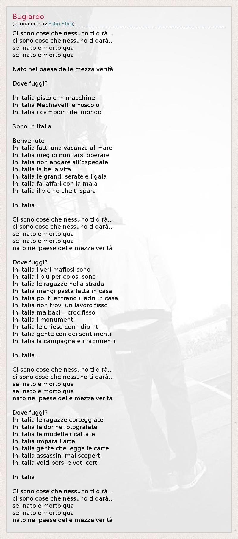 Есть вещи, о которых тебе никто не расскажет... Есть вещи, которые тебе никто не даст... Ты родился и умер здесь, Ты родился и умер здесь. Родился в стране полуправд. Куда ты убегаешь? В Италии пистолеты в машинах, В Италии Макиавелли 1 и Фосколо 2, В Италии чемпионы мира 3 Я в Италии Добро пожаловать В Италии съезди на море, В Италии лучше не оперироваться, В Италии не ходи в больницу, В Италии красивая жизнь, В Италии грандиозные вечеринки и праздники, В Италии занимайся грязным бизнесом, В Италии сосед, стреляющий в тебя. В Италии... Есть вещи, о которых тебе никто не расскажет... Есть вещи, которые тебе никто не даст... Ты родился и умер здесь, Ты родился и умер здесь. Родился в стране полуправд. Куда ты убегаешь? В Италии находится самая настоящая мафия, В Италии находятся самые опасные, В Италии девушки на дорогах, В Италии ты ешь пасту, приготовленную дома, В Италии потом к тебе в дом врываются воры, В Италии ты не находишь постоянную работу, В Италии, но целуешь распятие, В Италии монументы, В Италии церкви с росписями, В Италии люди с чувствами, В Италии деревни и похищения. В Италии... Есть вещи, о которых тебе никто не расскажет... Есть вещи, которые тебе никто не даст... Ты родился и умер здесь, Ты родился и умер здесь. Родился в стране полуправд. Куда ты убегаешь? В Италии девушки, за которыми ухаживают, В Италии женщины, которых фотографируют, В Италии модели, которых шантажируют, В Италии изучай искусство, В Италии люди, гадающие на картах, В Италии убийцы, которых никогда не найдут, В Италии потерянные лица и точные голоса. В Италии... Есть вещи, о которых тебе никто не расскажет... Есть вещи, которые тебе никто не даст... Ты родился и умер здесь, Ты родился и умер здесь. Родился в стране полуправд. 1 - итальянский политический мыслитель, писатель, историк, военный теоретик 2 - Уго Фосколо, итальянский поэт и филолог 3 - имеется в виду футбол