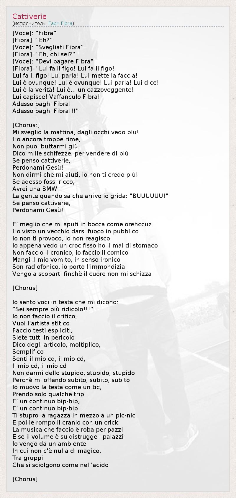 Это интересно:Фабрицио Тардуччи (Fabrizio Tarducci) – итальянский rapper, более известный как Fabri Fibra (Сенигаллия, 17 октября 1976). Фабри – старший брат другого итальянского rapper’а Nesly Rice.Начало пути: подростком начал интересоваться музыкой: первую запись сделал в 17 лет. Отличительная черта Фабри – это изменение тональности его голоса (особенно это слышно в альбоме «Mr. Simpatia») как в студийных записях, так и в... продолжение
