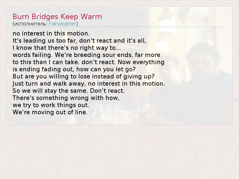 А как ты думаешь, о чем песня "Burn Bridges Keep Warm" ?