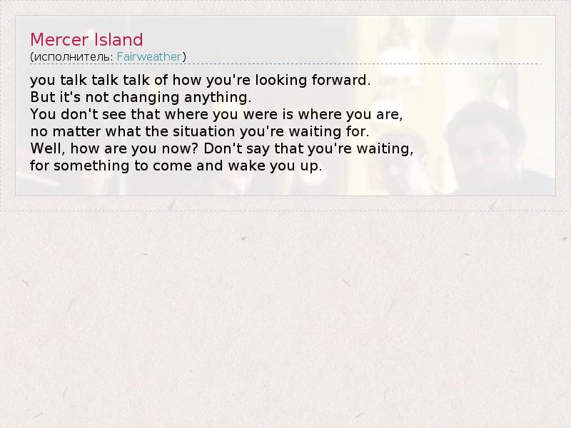 А как ты думаешь, о чем песня "Mercer Island" ?