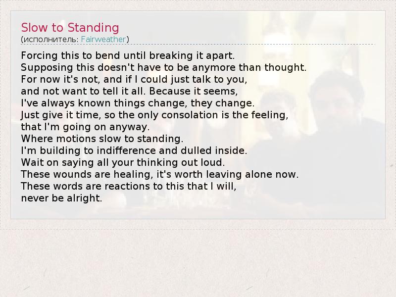 А как ты думаешь, о чем песня "Slow to Standing" ?