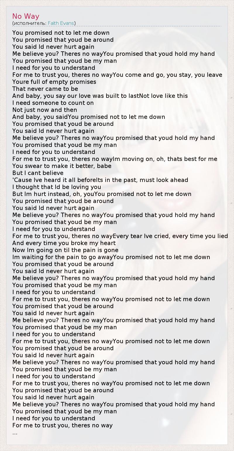 You promised not to let me down You promised that youd be around You said Id never hurt again Me believe you? Theres no wayYou promised that youd hold my hand You promised that youd be my man I need for you to understand For me to trust you, theres no wayYou come and go, you stay, you leave Youre full of empty promises That never came to be And baby, you say our love was built to lastNot love like this I need someone to count on Not just now and then And baby, you saidYou promised not to let me down You promised that youd be around You said Id never hurt again Me believe you? Theres no wayYou promised that youd hold my hand You promised that youd be my man I need for you to understand For me to trust you, theres no wayIm moving on, oh, thats best for me You swear to make it better, babe But I cant believe 'Cause Ive heard it all beforeIts in the past, must look ahead I thought that Id be loving you But Im hurt instead, oh, youYou promised not to let me down You promised that youd be around You said Id never hurt again Me believe you? Theres no wayYou promised that youd hold my hand You promised that youd be my man I need for you to understand For me to trust you, theres no wayEvery tear Ive cried, every time you lied And every time you broke my heart Now Im going on til the pain is gone Im waiting for the pain to go awayYou promised not to let me down You promised that youd be around You said Id never hurt again Me believe you? Theres no wayYou promised that youd hold my hand You promised that youd be my man I need for you to understand For me to trust you, theres no wayYou promised not to let me down You promised that youd be around You said Id never hurt again Me believe you? Theres no wayYou promised that youd hold my hand You promised that youd be my man I need for you to understand For me to trust you, theres no wayYou promised not to let me down You promised that youd be around You said Id never hurt again Me believe you? Theres no wayYou promised that youd hold my hand You promised that youd be my man I need for you to understand For me to trust you, theres no wayYou promised not to let me down You promised that youd be around You said Id never hurt again Me believe you? Theres no wayYou promised that youd hold my hand You promised that youd be my man I need for you to understand For me to trust you, theres no way ...