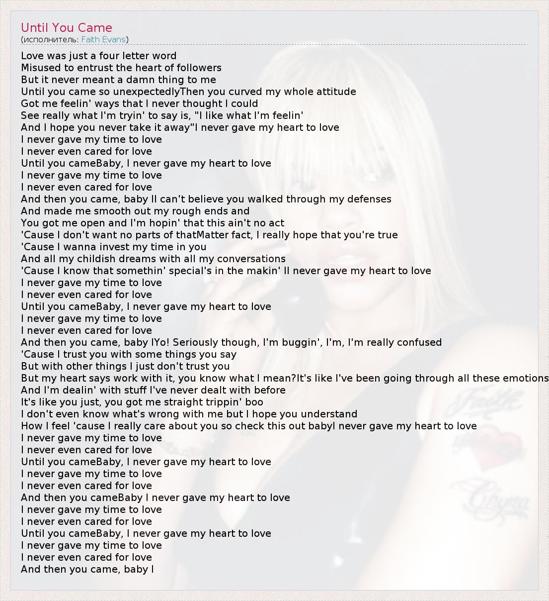 Love was just a four letter word Misused to entrust the heart of followers But it never meant a damn thing to me Until you came so unexpectedlyThen you curved my whole attitude Got me feelin' ways that I never thought I could See really what I'm tryin' to say is, "I like what I'm feelin' And I hope you never take it away"I never gave my heart to love I never gave my time to love I never even cared for love Until you cameBaby, I never gave my heart to love I never gave my time to love I never even cared for love And then you came, baby II can't believe you walked through my defenses And made me smooth out my rough ends and You got me open and I'm hopin' that this ain't no act 'Cause I don't want no parts of thatMatter fact, I really hope that you're true 'Cause I wanna invest my time in you And all my childish dreams with all my conversations 'Cause I know that somethin' special's in the makin' II never gave my heart to love I never gave my time to love I never even cared for love Until you cameBaby, I never gave my heart to love I never gave my time to love I never even cared for love And then you came, baby IYo! Seriously though, I'm buggin', I'm, I'm really confused 'Cause I trust you with some things you say But with other things I just don't trust you But my heart says work with it, you know what I mean?It's like I've been going through all these emotions And I'm dealin' with stuff I've never dealt with before It's like you just, you got me straight trippin' boo I don't even know what's wrong with me but I hope you understand How I feel 'cause I really care about you so check this out babyI never gave my heart to love I never gave my time to love I never even cared for love Until you cameBaby, I never gave my heart to love I never gave my time to love I never even cared for love And then you cameBaby I never gave my heart to love I never gave my time to love I never even cared for love Until you cameBaby, I never gave my heart to love I never gave my time to love I never even cared for love And then you came, baby I