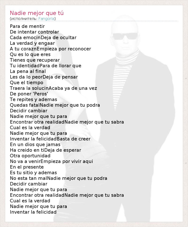 Para de mentir De intentar controlar Cada emocinDeja de ocultar La verdad y engaar A tu coraznEmpieza por reconocer Qu es lo que eres Tienes que recuperar Tu identidadPara de llorar que La pena al final Les da lo peorDeja de pensar Que el tiempo Traera la solucinAcaba ya de una vez De poner 'Peros' Te repites y ademas Quedas fatalNadie mejor que tu podra Decidir cambiar Nadie mejor que tu para Encontrar otra realidadNadie mejor que tu sabra Cual es la verdad Nadie mejor que tu para Inventar la felicidadBasta de creer En un dios que jamas Ha creido en tiDeja de esperar Otra oportunidad No va a venirEmpieza por vivir aqui En el presente Es tu sitio y ademas No esta tan malNadie mejor que tu podra Decidir cambiar Nadie mejor que tu para Encontrar otra realidadNadie mejor que tu sabra Cual es la verdad Nadie mejor que tu para Inventar la felicidad