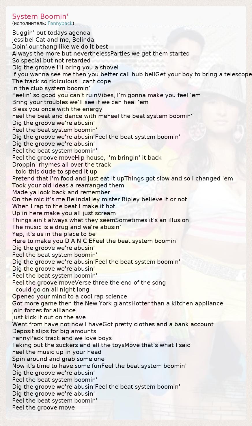 Buggin' out todays agenda Jessibel Cat and me, Belinda Doin' our thang like we do it best Always the more but neverthelessParties we get them started So special but not retarded Dig the groove I'll bring you a shovel If you wanna see me then you better call hub bellGet your boy to bring a telescope The track so ridiculous I cant cope In the club system boomin' Feelin' so good you can't ruinVibes, I'm gonna make you feel 'em Bring your troubles we'll see if we can heal 'em Bless you once with the energy Feel the beat and dance with meFeel the beat system boomin' Dig the groove we're abusin' Feel the beat system boomin' Dig the groove we're abusin'Feel the beat system boomin' Dig the groove we're abusin' Feel the beat system boomin' Feel the groove moveHip house, I'm bringin' it back Droppin' rhymes all over the track I told this dude to speed it up Pretend that I'm food and just eat it upThings got slow and so I changed 'em Took your old ideas a rearranged them Made ya look back and remember On the mic it's me BelindaHey mister Ripley believe it or not When I rap to the beat I make it hot Up in here make you all just scream Things ain't always what they seemSometimes it's an illusion The music is a drug and we're abusin' Yep, it's us in the place to be Here to make you D A N C EFeel the beat system boomin' Dig the groove we're abusin' Feel the beat system boomin' Dig the groove we're abusin'Feel the beat system boomin' Dig the groove we're abusin' Feel the beat system boomin' Feel the groove moveVerse three the end of the song I could go on all night long Opened your mind to a cool rap science Got more game then the New York giantsHotter than a kitchen appliance Join forces for alliance Just kick it out on the ave Went from have not now I haveGot pretty clothes and a bank account Deposit slips for big amounts FannyPack track and we love boys Taking out the suckers and all the toysMove that's what I said Feel the music up in your head Spin around and grab some one Now it's time to have some funFeel the beat system boomin' Dig the groove we're abusin' Feel the beat system boomin' Dig the groove we're abusin'Feel the beat system boomin' Dig the groove we're abusin' Feel the beat system boomin' Feel the groove move