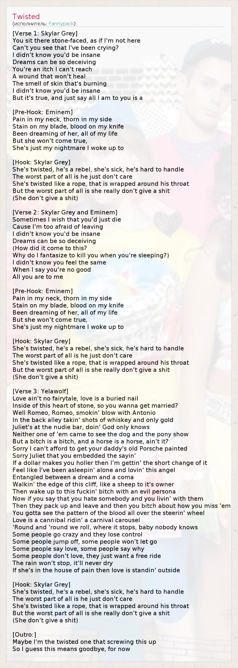 [Verse 1: Skylar Grey] You sit there stone-faced, as if I'm not here Can't you see that I've been crying? I didn't know you'd be insane Dreams can be so deceiving You're an itch I can't reach A wound that won't heal The smell of skin that's burning I didn't know you'd be insane But it's true, and just say all I am to you is a [Pre-Hook: Eminem] Pain in my neck, thorn in my side Stain on my blade, blood on my knife Been dreaming of her, all of my life But she won't come true, She's just my nightmare I woke up to [Hook: Skylar Grey] She's twisted, he's a rebel, she's sick, he's hard to handle The worst part of all is he just don't care She's twisted like a rope, that is wrapped around his throat But the worst part of all is she really don't give a shit (She don't give a shit) [Verse 2: Skylar Grey and Eminem] Sometimes I wish that you'd just die Cause I'm too afraid of leaving I didn't know you'd be insane Dreams can be so deceiving (How did it come to this? Why do I fantasize to kill you when you're sleeping?) I didn't know you feel the same When I say you're no good All you are to me [Pre-Hook: Eminem] Pain in my neck, thorn in my side Stain on my blade, blood on my knife Been dreaming of her, all of my life But she won't come true, She's just my nightmare I woke up to [Hook: Skylar Grey] She's twisted, he's a rebel, she's sick, he's hard to handle The worst part of all is he just don't care She's twisted like a rope, that is wrapped around his throat But the worst part of all is she really don't give a shit (She don't give a shit) [Verse 3: Yelawolf] Love ain't no fairytale, love is a buried nail Inside of this heart of stone, so you wanna get married? Well Romeo, Romeo, smokin' blow with Antonio In the back alley takin' shots of whiskey and only gold Juliet's at the nudie bar, doin' God only knows Neither one of 'em came to see the dog and the pony show But a bitch is a bitch, and a horse is a horse, ain't it? Sorry I can't afford to get your daddy's old Porsche painted Sorry Juliet that you embedded the sayin' If a dollar makes you holler then I'm gettin' the short change of it Feel like I've been asleepin' alone and lovin' this angel Entangled between a dream and a coma Walkin' the edge of this cliff, like a sheep to it's owner Then wake up to this fuckin' bitch with an evil persona Now if you say that you hate somebody and you livin' with them Then they pack up and leave and then you bitch about how you miss 'em You gotta see the pattern of the blood all over the steerin' wheel Love is a cannibal ridin' a carnival carousel 'Round and 'round we roll, where it stops, baby nobody knows Some people go crazy and they lose control Some people jump off, some people won't let go Some people say love, some people say why Some people don't love, they just want a free ride The rain won't stop, it'll never dry If she's in the house of pain then love is standin' outside [Hook: Skylar Grey] She's twisted, he's a rebel, she's sick, he's hard to handle The worst part of all is he just don't care She's twisted like a rope, that is wrapped around his throat But the worst part of all is she really don't give a shit (She don't give a shit) [Outro:] Maybe I'm the twisted one that screwing this up So I guess this means goodbye, for now