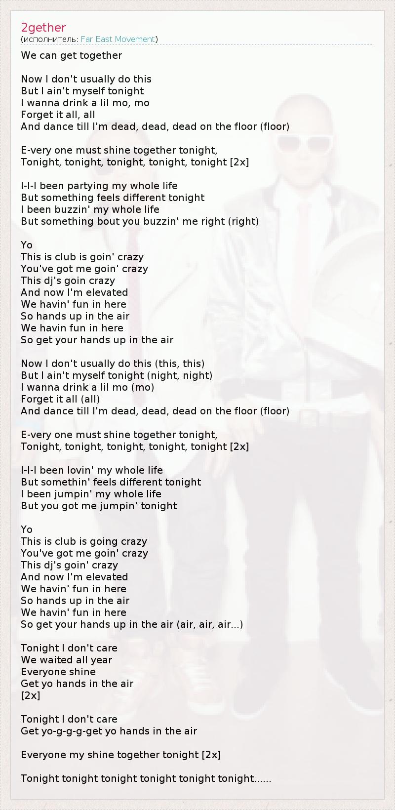 Мы можем собраться все вместе! Я обычно не делаю этого, Но сегодня ночью я сам не свой. Я хочу ещё немного выпить, Забыть про всё на свете И танцевать до упаду, до упаду, до упаду! Каждый может кутить вместе с нами сегодня, Сегодня, сегодня, сегодня, сегодня, сегодня [2 раза] Я тусил всю свою жизнь, Но сегодня что-то изменилось. Я всю свою жизнь провёл в эйфории, Но в тебе есть что-то такое, что вызывает особый трепет... Ёоу! Этот клуб сходит с ума! Ты сводишь меня с ума! Ди-джей сходит с ума! А я навеселе! Мы веселимся от души, Так что поднимите все руки в воздух! Мы веселимся от души, Все! Поднимите руки в воздух! Я обычно не делаю этого (этого) Но сегодня я сам не свой (сегодня ночью) Я хочу ещё немного выпить (ещё) Забыть про всё на свете (всё) И танцевать до упаду, до упаду, до упаду! Каждый может кутить вместе с нами сегодня, Сегодня, сегодня, сегодня, сегодня, сегодня [2 раза] Я был влюблён в кого-то всю свою жизнь, Но сегодня что-то изменилось. Я веселился всю свою жизнь, Но ты этой ночью ты заставился меня веселиться бурно как никогда! Этот клуб сходит с ума! Ты сводишь меня с ума! Ди-джей сходит с ума! А я навеселе! Мы веселимся от души, Так что поднимите все руки в воздух! Мы веселимся от души, Все! Поднимите руки в воздух! Сегодня мне всё равно, Мы ждали этого момента весь год! Все светятся от счастья, Поднимите руки в воздух! [2 раза] Сегодня мне всё равно, Поднимите руки в воздух! Все тусят вместе с нами сегодня ночью [2 раза] Сегодня ночью, сегодня ночью, сегодня ночью...