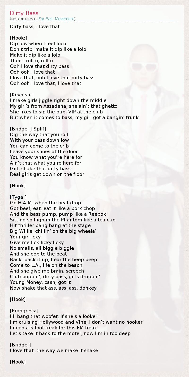 * – Как объясняют сами участники группы Far East Movement, название песни представляет собой каламбур, построенный на созвучии слов bass – "бас" и ass – "з*дница".