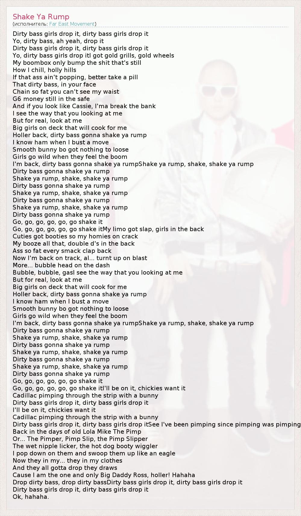 Dirty bass girls drop it, dirty bass girls drop it Yo, dirty bass, ah yeah, drop it Dirty bass girls drop it, dirty bass girls drop it Yo, dirty bass girls drop itI got gold grills, gold wheels My boombox only bump the shit that's still How I chill, holly hills If that ass ain't popping, better take a pill That dirty bass, in your face Chain so fat you can't see my waist G6 money still in the safe And if you look like Cassie, I'ma break the bank I see the way that you looking at me But for real, look at me Big girls on deck that will cook for me Holler back, dirty bass gonna shake ya rump I know ham when I bust a move Smooth bunny bo got nothing to loose Girls go wild when they feel the boom I'm back, dirty bass gonna shake ya rumpShake ya rump, shake, shake ya rump Dirty bass gonna shake ya rump Shake ya rump, shake, shake ya rump Dirty bass gonna shake ya rump Shake ya rump, shake, shake ya rump Dirty bass gonna shake ya rump Shake ya rump, shake, shake ya rump Dirty bass gonna shake ya rump Go, go, go, go, go, go shake it Go, go, go, go, go, go shake itMy limo got slap, girls in the back Cuties got booties so my homies on crack My booze all that, double d's in the back Ass so fat every smack clap back Now I'm back on track, al... turnt up on blast More... bubble head on the dash Bubble, bubble, gasI see the way that you looking at me But for real, look at me Big girls on deck that will cook for me Holler back, dirty bass gonna shake ya rump I know ham when I bust a move Smooth bunny bo got nothing to loose Girls go wild when they feel the boom I'm back, dirty bass gonna shake ya rumpShake ya rump, shake, shake ya rump Dirty bass gonna shake ya rump Shake ya rump, shake, shake ya rump Dirty bass gonna shake ya rump Shake ya rump, shake, shake ya rump Dirty bass gonna shake ya rump Shake ya rump, shake, shake ya rump Dirty bass gonna shake ya rump Go, go, go, go, go, go shake it Go, go, go, go, go, go shake itI'll be on it, chickies want it Cadillac pimping through the strip with a bunny Dirty bass girls drop it, dirty bass girls drop it I'll be on it, chickies want it Cadillac pimping through the strip with a bunny Dirty bass girls drop it, dirty bass girls drop itSee I've been pimping since pimping was pimping Back in the days of old Lola Mike The Pimp Or... The Pimper, Pimp Slip, the Pimp Slipper The wet nipple licker, the hot dog booty wiggler I pop down on them and swoop them up like an eagle Now they in my... they in my clothes And they all gotta drop they draws Cause I am the one and only Big Daddy Ross, holler! Hahaha Drop dirty bass, drop dirty bassDirty bass girls drop it, dirty bass girls drop it Dirty bass girls drop it, dirty bass girls drop it Ok, hahaha.