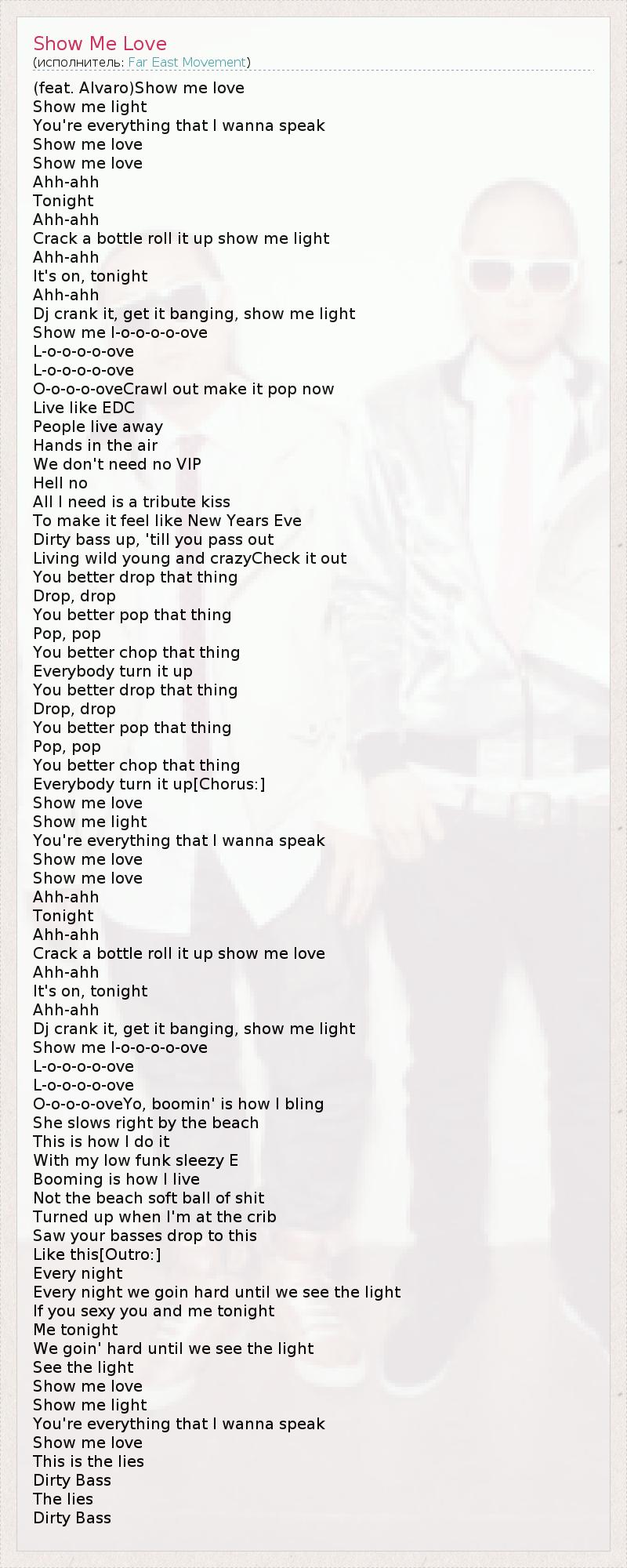 (feat. Alvaro)Show me love Show me light You're everything that I wanna speak Show me love Show me love Ahh-ahh Tonight Ahh-ahh Crack a bottle roll it up show me light Ahh-ahh It's on, tonight Ahh-ahh Dj crank it, get it banging, show me light Show me l-o-o-o-o-ove L-o-o-o-o-ove L-o-o-o-o-ove O-o-o-o-oveCrawl out make it pop now Live like EDC People live away Hands in the air We don't need no VIP Hell no All I need is a tribute kiss To make it feel like New Years Eve Dirty bass up, 'till you pass out Living wild young and crazyCheck it out You better drop that thing Drop, drop You better pop that thing Pop, pop You better chop that thing Everybody turn it up You better drop that thing Drop, drop You better pop that thing Pop, pop You better chop that thing Everybody turn it up[Chorus:] Show me love Show me light You're everything that I wanna speak Show me love Show me love Ahh-ahh Tonight Ahh-ahh Crack a bottle roll it up show me love Ahh-ahh It's on, tonight Ahh-ahh Dj crank it, get it banging, show me light Show me l-o-o-o-o-ove L-o-o-o-o-ove L-o-o-o-o-ove O-o-o-o-oveYo, boomin' is how I bling She slows right by the beach This is how I do it With my low funk sleezy E Booming is how I live Not the beach soft ball of shit Turned up when I'm at the crib Saw your basses drop to this Like this[Outro:] Every night Every night we goin hard until we see the light If you sexy you and me tonight Me tonight We goin' hard until we see the light See the light Show me love Show me light You're everything that I wanna speak Show me love This is the lies Dirty Bass The lies Dirty Bass