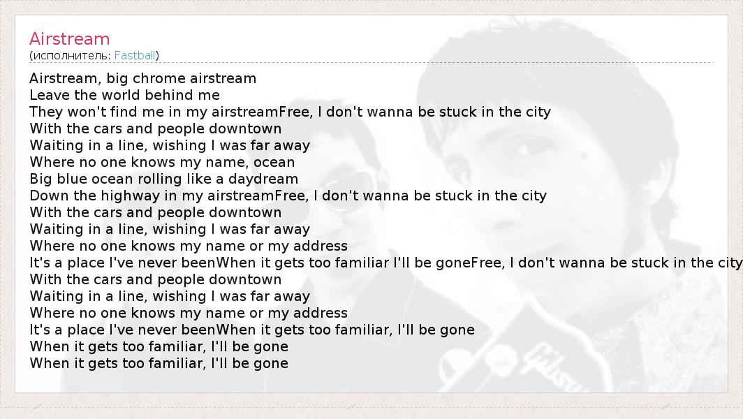 Down the highway in my airstreamFree, I don't wanna be stuck in the city