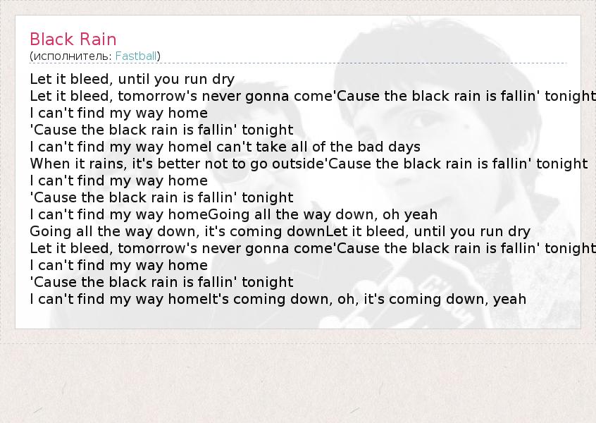 Let it bleed, until you run dry Let it bleed, tomorrow's never gonna come'Cause the black rain is fallin' tonight I can't find my way home 'Cause the black rain is fallin' tonight I can't find my way homeI can't take all of the bad days When it rains, it's better not to go outside'Cause the black rain is fallin' tonight I can't find my way home 'Cause the black rain is fallin' tonight I can't find my way homeGoing all the way down, oh yeah Going all the way down, it's coming downLet it bleed, until you run dry Let it bleed, tomorrow's never gonna come'Cause the black rain is fallin' tonight I can't find my way home 'Cause the black rain is fallin' tonight I can't find my way homeIt's coming down, oh, it's coming down, yeah