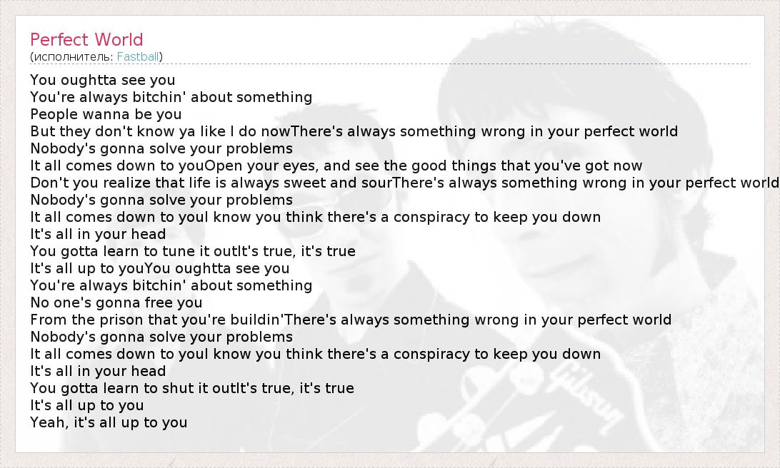 But they don't know ya like I do nowThere's always something wrong in your perfect world