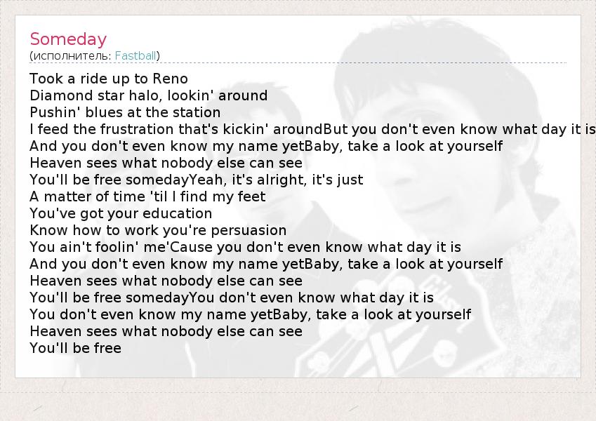 Took a ride up to Reno Diamond star halo, lookin' around Pushin' blues at the station I feed the frustration that's kickin' aroundBut you don't even know what day it is And you don't even know my name yetBaby, take a look at yourself Heaven sees what nobody else can see You'll be free somedayYeah, it's alright, it's just A matter of time 'til I find my feet You've got your education Know how to work you're persuasion You ain't foolin' me'Cause you don't even know what day it is And you don't even know my name yetBaby, take a look at yourself Heaven sees what nobody else can see You'll be free somedayYou don't even know what day it is You don't even know my name yetBaby, take a look at yourself Heaven sees what nobody else can see You'll be free