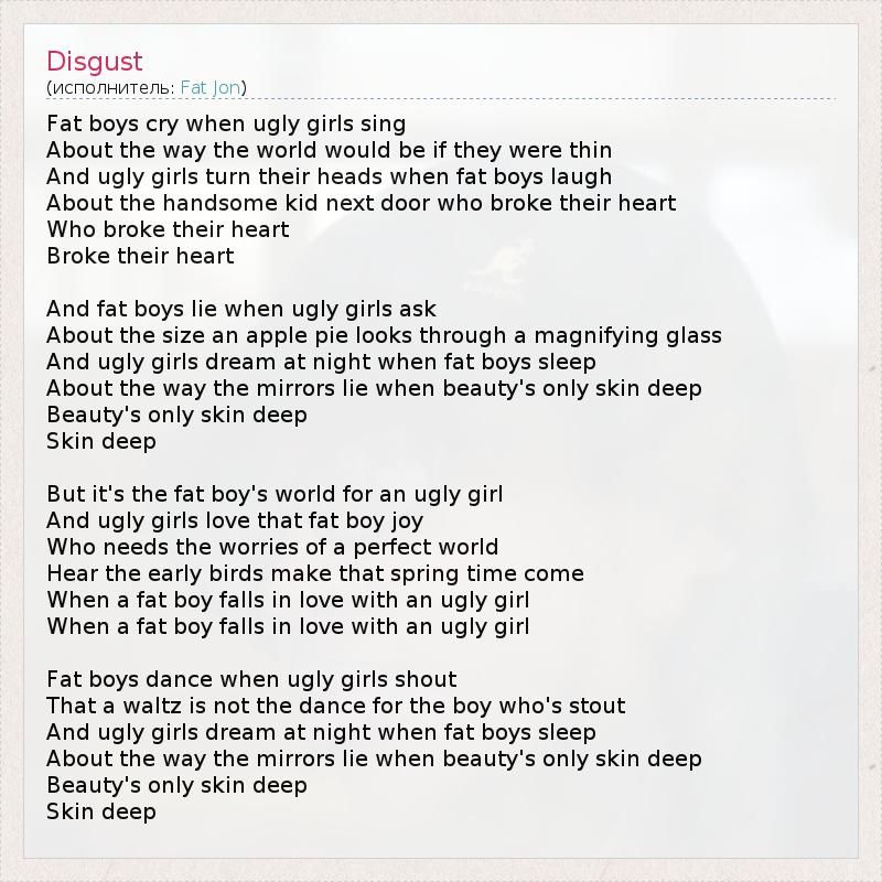 Fat boys cry when ugly girls sing About the way the world would be if they were thin And ugly girls turn their heads when fat boys laugh About the handsome kid next door who broke their heart Who broke their heart Broke their heart And fat boys lie when ugly girls ask About the size an apple pie looks through a magnifying glass And ugly girls dream at night when fat boys sleep About the way the mirrors lie when beauty's only skin deep Beauty's only skin deep Skin deep But it's the fat boy's world for an ugly girl And ugly girls love that fat boy joy Who needs the worries of a perfect world Hear the early birds make that spring time come When a fat boy falls in love with an ugly girl When a fat boy falls in love with an ugly girl Fat boys dance when ugly girls shout That a waltz is not the dance for the boy who's stout And ugly girls dream at night when fat boys sleep About the way the mirrors lie when beauty's only skin deep Beauty's only skin deep Skin deep