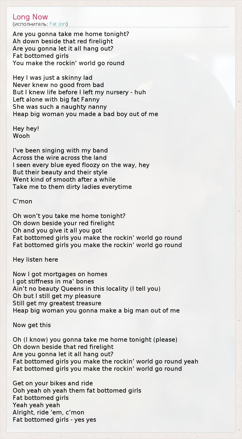 Are you gonna take me home tonight? Ah down beside that red firelight Are you gonna let it all hang out? Fat bottomed girls You make the rockin' world go round Hey I was just a skinny lad Never knew no good from bad But I knew life before I left my nursery - huh Left alone with big fat Fanny She was such a naughty nanny Heap big woman you made a bad boy out of me Hey hey! Wooh I've been singing with my band Across the wire across the land I seen every blue eyed floozy on the way, hey But their beauty and their style Went kind of smooth after a while Take me to them dirty ladies everytime C'mon Oh won't you take me home tonight? Oh down beside your red firelight Oh and you give it all you got Fat bottomed girls you make the rockin' world go round Fat bottomed girls you make the rockin' world go round Hey listen here Now I got mortgages on homes I got stiffness in ma' bones Ain't no beauty Queens in this locality (I tell you) Oh but I still get my pleasure Still get my greatest treasure Heap big woman you gonna make a big man out of me Now get this Oh (I know) you gonna take me home tonight (please) Oh down beside that red firelight Are you gonna let it all hang out? Fat bottomed girls you make the rockin' world go round yeah Fat bottomed girls you make the rockin' world go round Get on your bikes and ride Ooh yeah oh yeah them fat bottomed girls Fat bottomed girls Yeah yeah yeah Alright, ride 'em, c'mon Fat bottomed girls - yes yes