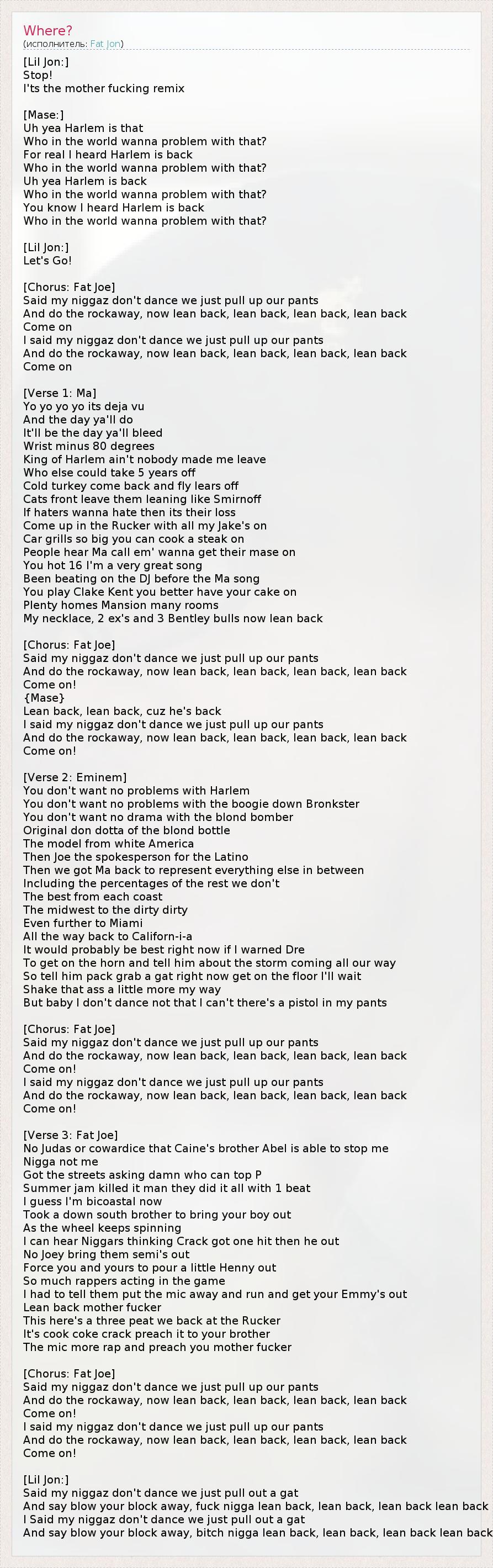 And say blow your block away, fuck nigga lean back, lean back, lean back lean back
