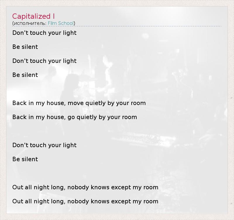 Don't touch your light Be silent Don't touch your light Be silent Back in my house, move quietly by your room Back in my house, go quietly by your room Don't touch your light Be silent Out all night long, nobody knows except my room Out all night long, nobody knows except my room