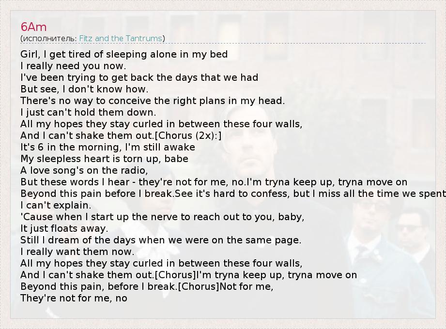 Это интересно:Fitz and the Tantrums - американская соул-поп-группа из Лос-Анджелеса, созданная в 2008 году.Дебютный студийный альбом группы Pickin' Up the Pieces, выпущенный в августе 2010, получил критическое признание и достиг № 1 в чартах Billboard Heatseekers. Fitz and the Tantrums исполнили свой известный сингл "MoneyGrabber" на ABC's Jimmy Kimmel Live, TBS's Conan и NBC's The Tonight Show with Jay Leno, а также активно гастролировали в Соединенных Штатах и... продолжение
