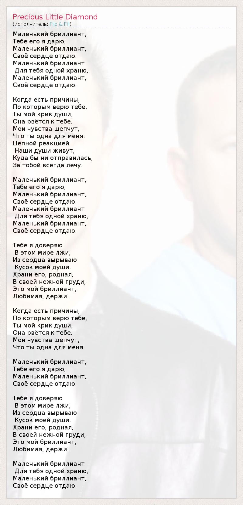 Маленький бриллиант, Тебе его я дарю, Маленький бриллиант, Своё сердце отдаю. Маленький бриллиант Для тебя одной храню, Маленький бриллиант, Своё сердце отдаю. Когда есть причины, По которым верю тебе, Ты мой крик души, Она рвётся к тебе. Мои чувства шепчут, Что ты одна для меня. Цепной реакцией Наши души живут, Куда бы ни отправилась, За тобой всегда лечу. Маленький бриллиант, Тебе его я дарю, Маленький бриллиант, Своё сердце отдаю. Маленький бриллиант Для тебя одной храню, Маленький бриллиант, Своё сердце отдаю. Тебе я доверяю В этом мире лжи, Из сердца вырываю Кусок моей души. Храни его, родная, В своей нежной груди, Это мой бриллиант, Любимая, держи. Когда есть причины, По которым верю тебе, Ты мой крик души, Она рвётся к тебе. Мои чувства шепчут, Что ты одна для меня. Маленький бриллиант, Тебе его я дарю, Маленький бриллиант, Своё сердце отдаю. Тебе я доверяю В этом мире лжи, Из сердца вырываю Кусок моей души. Храни его, родная, В своей нежной груди, Это мой бриллиант, Любимая, держи. Маленький бриллиант Для тебя одной храню, Маленький бриллиант, Своё сердце отдаю.