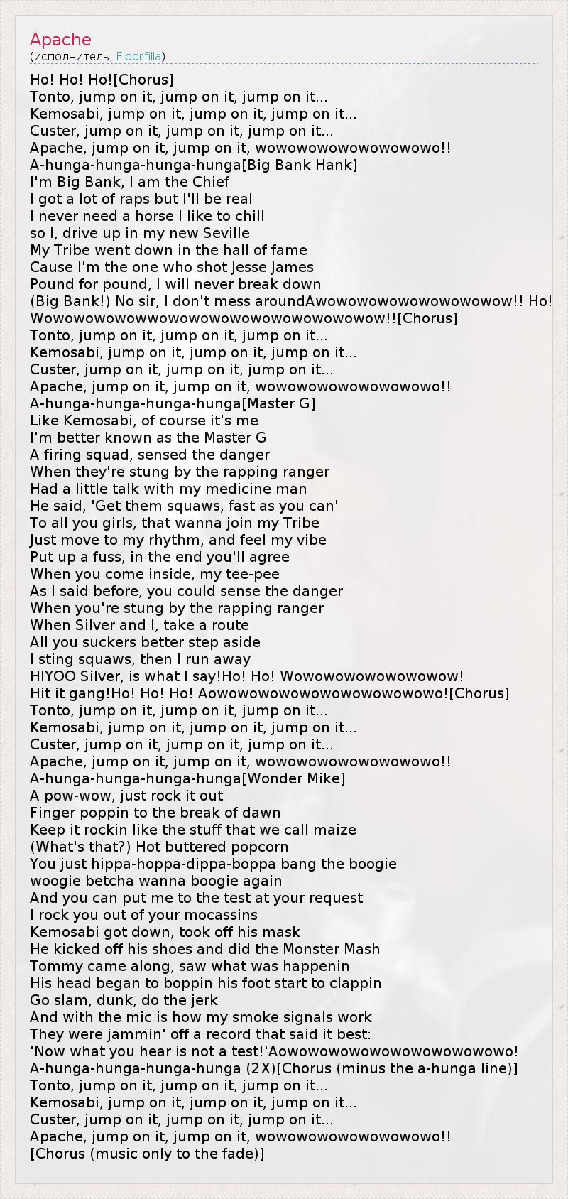 Ho! Ho! Ho![Chorus] Tonto, jump on it, jump on it, jump on it... Kemosabi, jump on it, jump on it, jump on it... Custer, jump on it, jump on it, jump on it... Apache, jump on it, jump on it, wowowowowowowowowo!! A-hunga-hunga-hunga-hunga[Big Bank Hank] I'm Big Bank, I am the Chief I got a lot of raps but I'll be real I never need a horse I like to chill so I, drive up in my new Seville My Tribe went down in the hall of fame Cause I'm the one who shot Jesse James Pound for pound, I will never break down (Big Bank!) No sir, I don't mess aroundAwowowowowowowowowow!! Ho! Wowowowowowwowowowowowowowowowowow!![Chorus] Tonto, jump on it, jump on it, jump on it... Kemosabi, jump on it, jump on it, jump on it... Custer, jump on it, jump on it, jump on it... Apache, jump on it, jump on it, wowowowowowowowowo!! A-hunga-hunga-hunga-hunga[Master G] Like Kemosabi, of course it's me I'm better known as the Master G A firing squad, sensed the danger When they're stung by the rapping ranger Had a little talk with my medicine man He said, 'Get them squaws, fast as you can' To all you girls, that wanna join my Tribe Just move to my rhythm, and feel my vibe Put up a fuss, in the end you'll agree When you come inside, my tee-pee As I said before, you could sense the danger When you're stung by the rapping ranger When Silver and I, take a route All you suckers better step aside I sting squaws, then I run away HIYOO Silver, is what I say!Ho! Ho! Wowowowowowowowow! Hit it gang!Ho! Ho! Ho! Aowowowowowowowowowowowo![Chorus] Tonto, jump on it, jump on it, jump on it... Kemosabi, jump on it, jump on it, jump on it... Custer, jump on it, jump on it, jump on it... Apache, jump on it, jump on it, wowowowowowowowowo!! A-hunga-hunga-hunga-hunga[Wonder Mike] A pow-wow, just rock it out Finger poppin to the break of dawn Keep it rockin like the stuff that we call maize (What's that?) Hot buttered popcorn You just hippa-hoppa-dippa-boppa bang the boogie woogie betcha wanna boogie again And you can put me to the test at your request I rock you out of your mocassins Kemosabi got down, took off his mask He kicked off his shoes and did the Monster Mash Tommy came along, saw what was happenin His head began to boppin his foot start to clappin Go slam, dunk, do the jerk And with the mic is how my smoke signals work They were jammin' off a record that said it best: 'Now what you hear is not a test!'Aowowowowowowowowowowowo! A-hunga-hunga-hunga-hunga (2X)[Chorus (minus the a-hunga line)] Tonto, jump on it, jump on it, jump on it... Kemosabi, jump on it, jump on it, jump on it... Custer, jump on it, jump on it, jump on it... Apache, jump on it, jump on it, wowowowowowowowowo!! [Chorus (music only to the fade)]