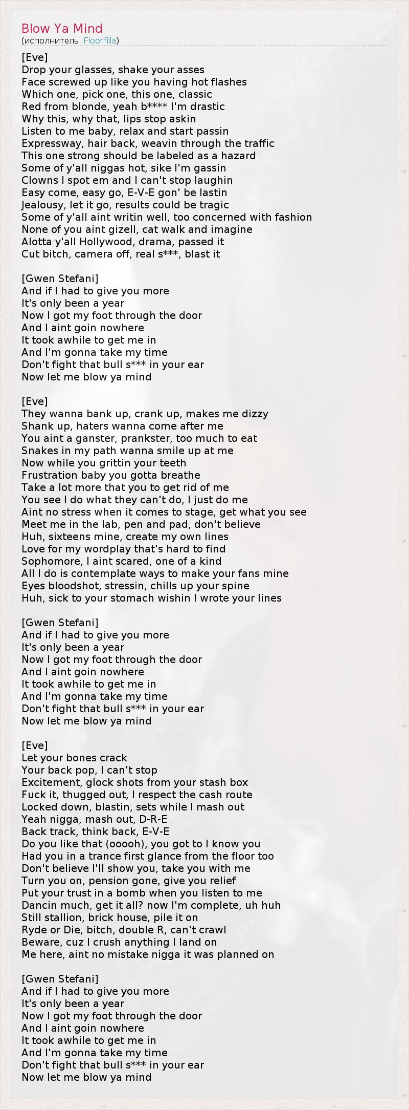 [Eve] Drop your glasses, shake your asses Face screwed up like you having hot flashes Which one, pick one, this one, classic Red from blonde, yeah b**** I'm drastic Why this, why that, lips stop askin Listen to me baby, relax and start passin Expressway, hair back, weavin through the traffic This one strong should be labeled as a hazard Some of y'all niggas hot, sike I'm gassin Clowns I spot em and I can't stop laughin Easy come, easy go, E-V-E gon' be lastin Jealousy, let it go, results could be tragic Some of y'all aint writin well, too concerned with fashion None of you aint gizell, cat walk and imagine Alotta y'all Hollywood, drama, passed it Cut bitch, camera off, real s***, blast it [Gwen Stefani] And if I had to give you more It's only been a year Now I got my foot through the door And I aint goin nowhere It took awhile to get me in And I'm gonna take my time Don't fight that bull s*** in your ear Now let me blow ya mind [Eve] They wanna bank up, crank up, makes me dizzy Shank up, haters wanna come after me You aint a ganster, prankster, too much to eat Snakes in my path wanna smile up at me Now while you grittin your teeth Frustration baby you gotta breathe Take a lot more that you to get rid of me You see I do what they can't do, I just do me Aint no stress when it comes to stage, get what you see Meet me in the lab, pen and pad, don't believe Huh, sixteens mine, create my own lines Love for my wordplay that's hard to find Sophomore, I aint scared, one of a kind All I do is contemplate ways to make your fans mine Eyes bloodshot, stressin, chills up your spine Huh, sick to your stomach wishin I wrote your lines [Gwen Stefani] And if I had to give you more It's only been a year Now I got my foot through the door And I aint goin nowhere It took awhile to get me in And I'm gonna take my time Don't fight that bull s*** in your ear Now let me blow ya mind [Eve] Let your bones crack Your back pop, I can't stop Excitement, glock shots from your stash box Fuck it, thugged out, I respect the cash route Locked down, blastin, sets while I mash out Yeah nigga, mash out, D-R-E Back track, think back, E-V-E Do you like that (ooooh), you got to I know you Had you in a trance first glance from the floor too Don't believe I'll show you, take you with me Turn you on, pension gone, give you relief Put your trust in a bomb when you listen to me Dancin much, get it all? now I'm complete, uh huh Still stallion, brick house, pile it on Ryde or Die, bitch, double R, can't crawl Beware, cuz I crush anything I land on Me here, aint no mistake nigga it was planned on [Gwen Stefani] And if I had to give you more It's only been a year Now I got my foot through the door And I aint goin nowhere It took awhile to get me in And I'm gonna take my time Don't fight that bull s*** in your ear Now let me blow ya mind