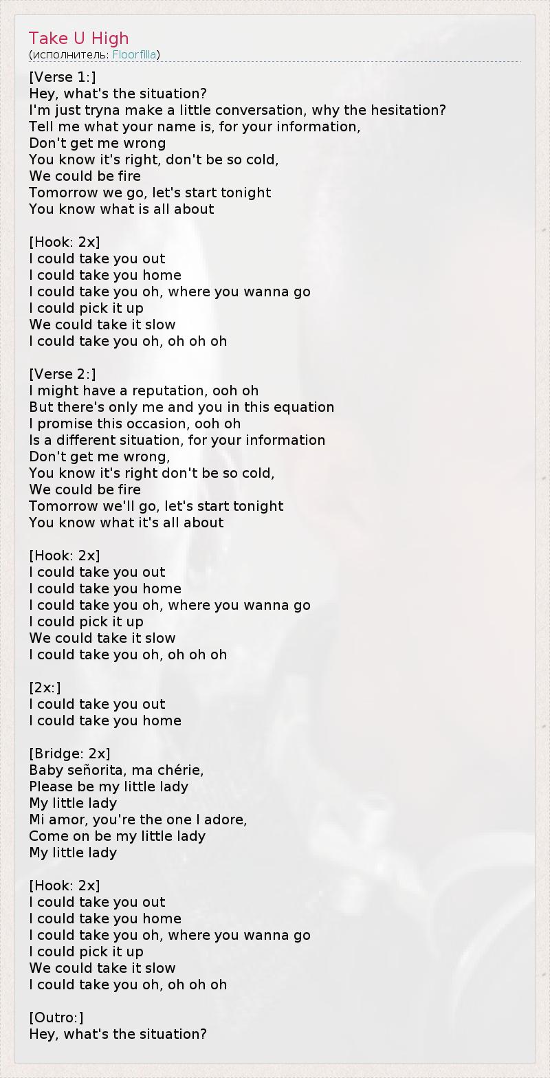 [Verse 1:] Hey, what's the situation? I'm just tryna make a little conversation, why the hesitation? Tell me what your name is, for your information, Don't get me wrong You know it's right, don't be so cold, We could be fire Tomorrow we go, let's start tonight You know what is all about [Hook: 2x] I could take you out I could take you home I could take you oh, where you wanna go I could pick it up We could take it slow I could take you oh, oh oh oh [Verse 2:] I might have a reputation, ooh oh But there's only me and you in this equation I promise this occasion, ooh oh Is a different situation, for your information Don't get me wrong, You know it's right don't be so cold, We could be fire Tomorrow we'll go, let's start tonight You know what it's all about [Hook: 2x] I could take you out I could take you home I could take you oh, where you wanna go I could pick it up We could take it slow I could take you oh, oh oh oh [2x:] I could take you out I could take you home [Bridge: 2x] Baby señorita, ma chérie, Please be my little lady My little lady Mi amor, you're the one I adore, Come on be my little lady My little lady [Hook: 2x] I could take you out I could take you home I could take you oh, where you wanna go I could pick it up We could take it slow I could take you oh, oh oh oh [Outro:] Hey, what's the situation?