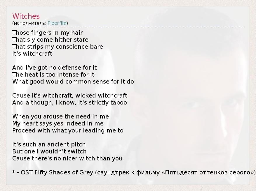 Those fingers in my hair That sly come hither stare That strips my conscience bare It's witchcraft And I've got no defense for it The heat is too intense for it What good would common sense for it do Cause it's witchcraft, wicked witchcraft And although, I know, it's strictly taboo When you arouse the need in me My heart says yes indeed in me Proceed with what your leading me to It's such an ancient pitch But one I wouldn't switch Cause there's no nicer witch than you * - OST Fifty Shades of Grey (cаундтрек к фильму «Пятьдесят оттенков серого»)